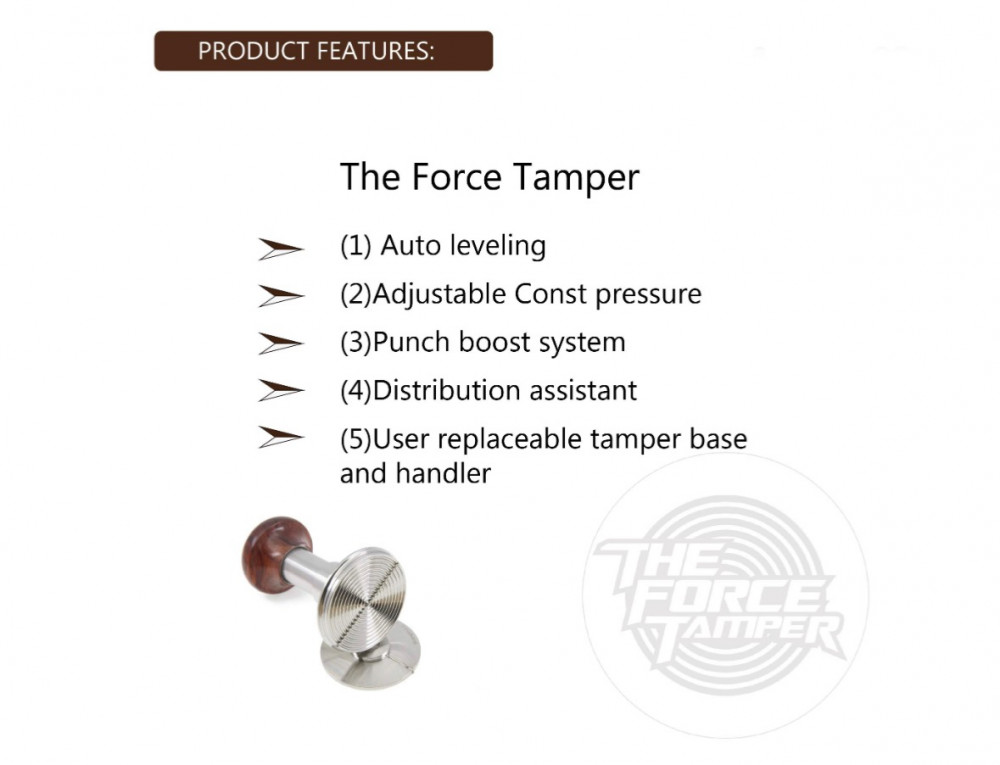 فورس تامبر الحاصل على جائزة red dot كأفضل تصميم ضمن الكبس بمقدار ثابت في كل مرة لتجنب شدة الضغط المتفاوتة مقارنة بالضغط اليدي التقليدي قابل للتعديل للتحكم بشدة الكبس اللفة الواحدة تعادل 0،5 كيلوجراممزود بقاعدة من السيليكون بشعار الشركة